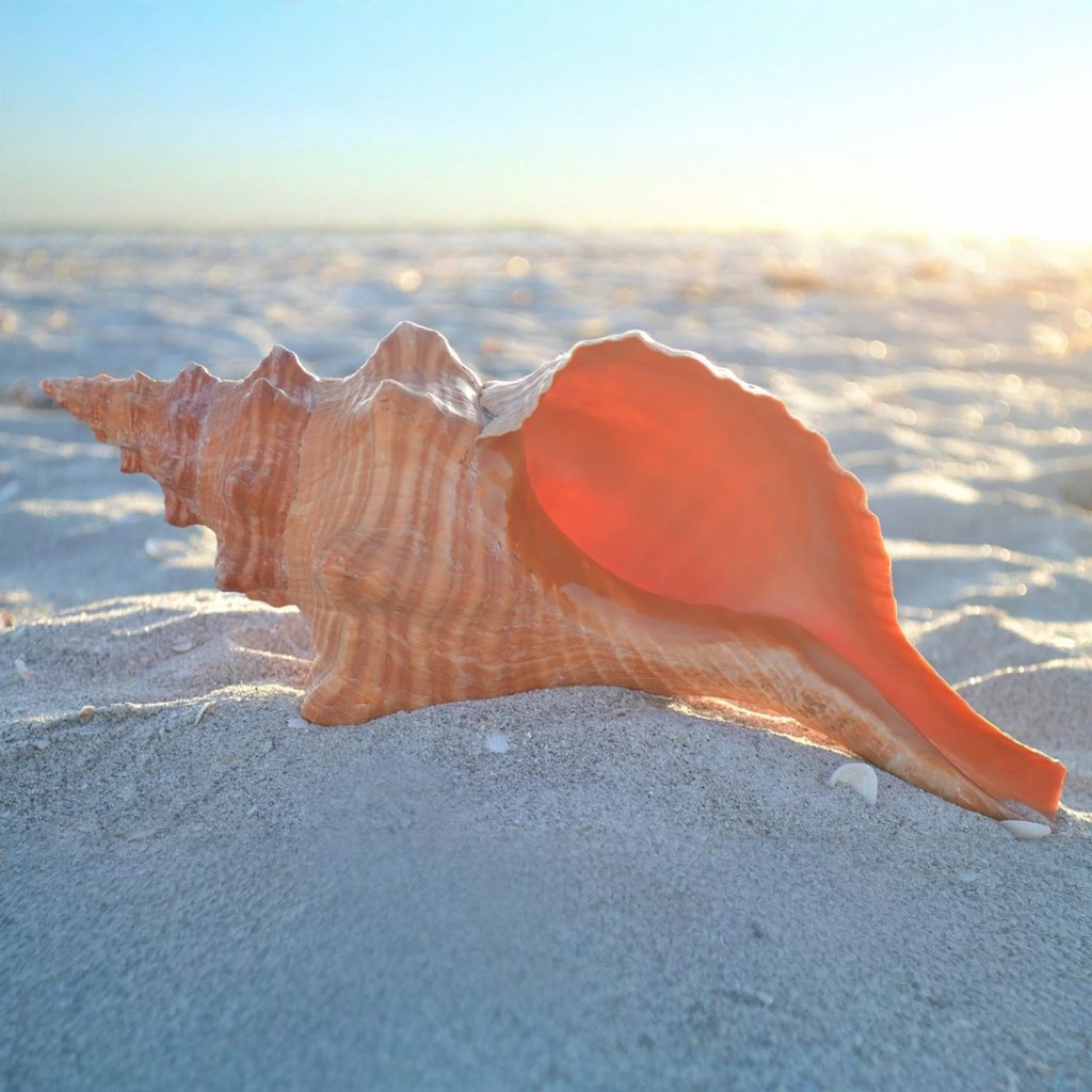 Bathed in golden light upon the shore, this conch reveals its radiant coral interior — a natural sculpture where sea, sun, and form converge. A piece that speaks both of elemental origins and timeless artistry.